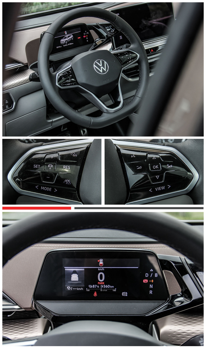 ID.6 X搭载了全触控式的三辐式方向盘,采用真皮材质包裹,握环粗壮且握感非常细腻。两侧的多功能按键布局合理,并装备振动反馈功能,操作起来十分便利,但亮黑色触控面非常容易留下指纹,爱干净朋友需要经常擦拭。方向盘后方的仪表盘为5.3英寸,虽然尺寸不大,但是UI设计简洁,可显示详细的行车数据和导航信息。