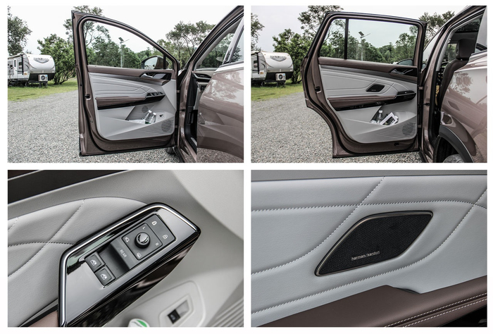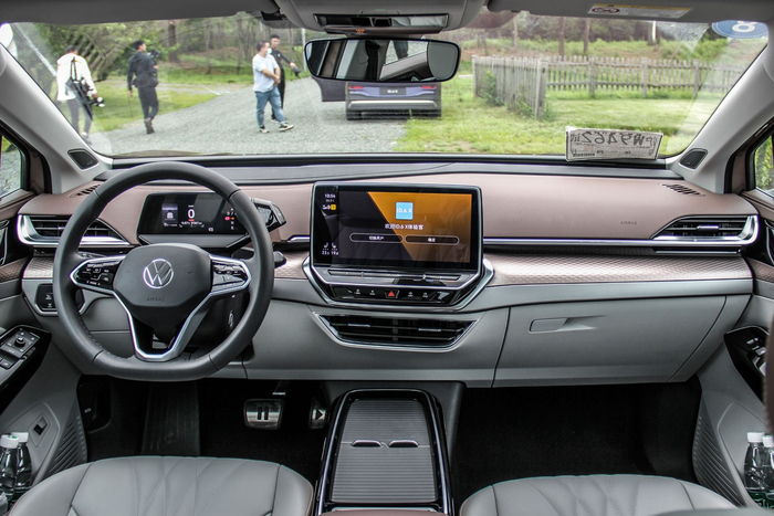 进入内饰,可以看出ID.6 X采用了标准化ID系列设计,从布局到配置都与ID.4 X如出一辙,最显著的特点就是简洁、不复杂。但在用料和配色等细节方面,ID.6 X要更显考究,尤其是中控台与座椅采用了与车漆同色的皮质,配合菱形格纹饰条,使整个车厢内的氛围了高级不少。