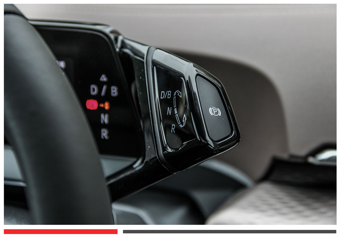 ID.6X搭载了电动车常见的固定齿比变速箱,换挡手柄依旧位于仪表盘右侧与ID.4X相同,通过选转的方式进行换挡操作,向上为D挡/B挡,向下为R挡,P挡轻按即可,初次接触还需要时间去适应。
