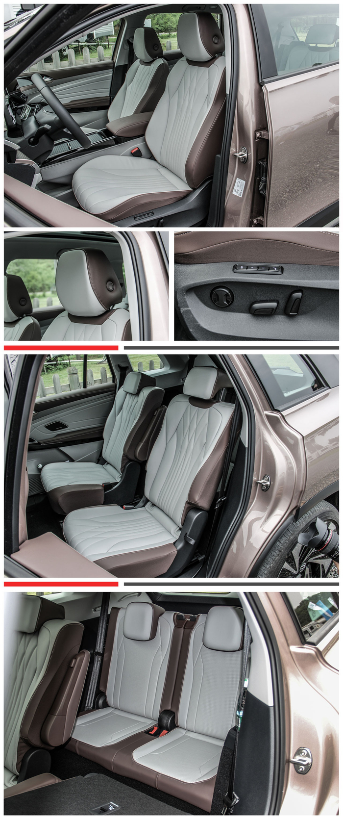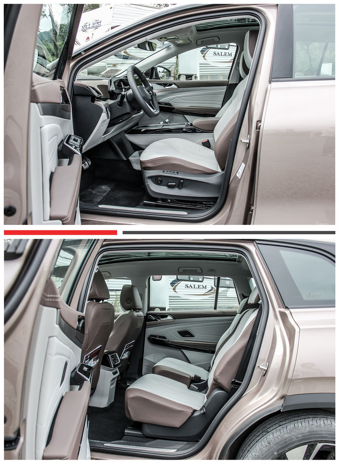 ID.6 X拥有6座/7座两种座椅布局形式,此次试驾车型为6座采用2+2+2的座椅布局。全车座椅采用双拼色真皮材质,并进行了打孔处理。前排座椅比较宽大填充物较为厚实,乘坐体验更加舒适,坐垫长短适中,对腿部支撑有着不错的表现。功能方面十分丰富,主/副驾座椅均配备电动调节、电动腰撑、座椅加热、气动按摩等功能,其中主驾座椅还配备记忆及上车礼让等功能。