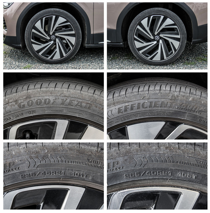 来到车身侧面,ID.6 X的长宽高为4876/1848/1680mm,轴距为2965mm,定位于中大型SUV。在车轮方面,试驾的四驱车型采用了21英寸多辐轮圈 ,造型与ID.4 X保持一致,轮胎规格为前235/45 R21、后265/40 R21。另外,ID.6 X依旧使用后轮鼓刹的配置,先不说够不够用,关键是看起来很掉价。