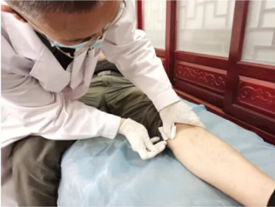戴上无菌手套、拿起消过毒的小针刀、在疼痛部位擦碘酒、酒精脱碘……顾学众主任入针很快,小针刀顺着肌肉纹理扎到患处,切割粘连,左旋右转,几秒钟拔出,又选患者一痛处,二次下针,治疗结束,疼痛非常小。