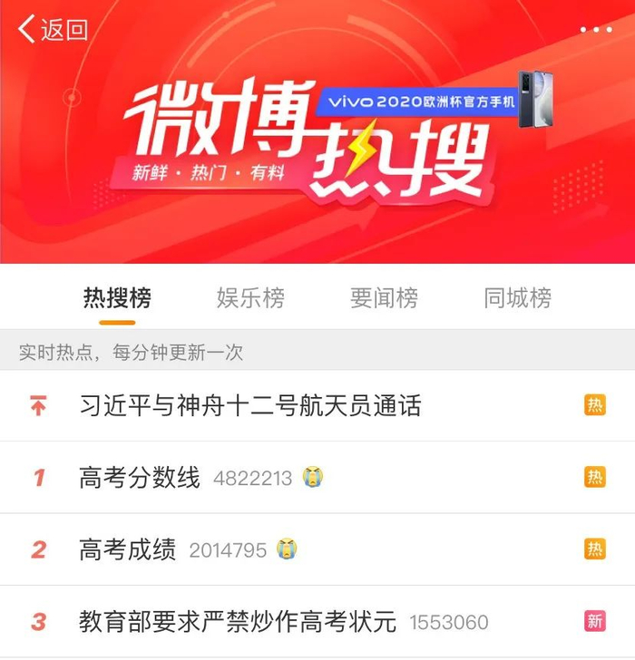 据息,国家教育部23日发出通知,严禁相关媒体、培训机构、中学炒作“高考状元”“高考升学率”等信息。此后,网络上的相关信息逐渐消散。
