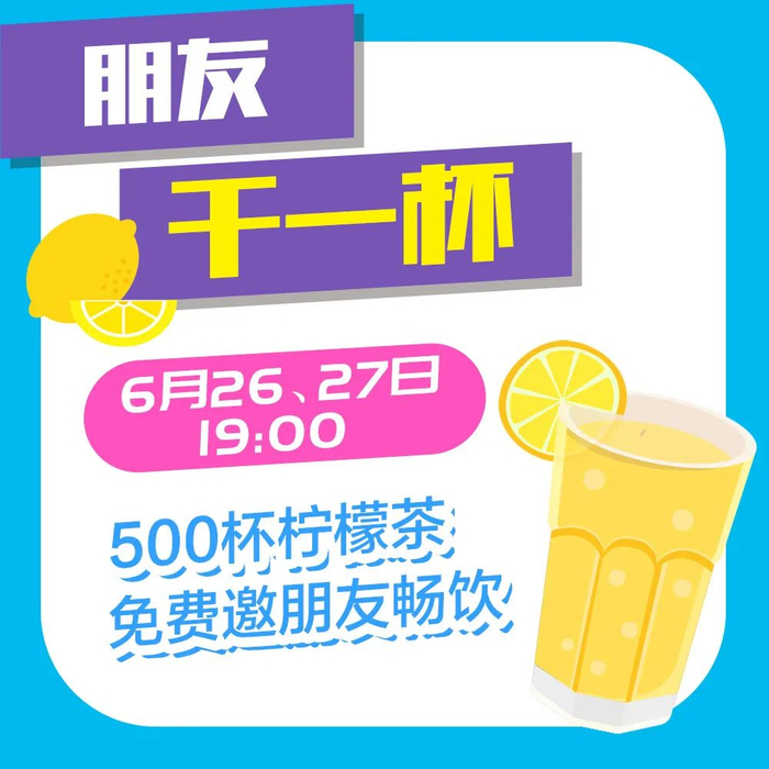 6月26、27日19:00-21:00,500杯柠檬茶免费送,还有小型音乐会跟你一起玩转年中庆!邀请新梦新老朋友一起来相聚一段闲暇时光,喝一杯柠檬茶、听听音乐、吹吹傍晚的风,随意跳跳舞……