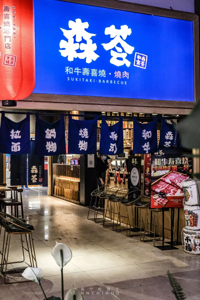 在新梦,王欣民有两家店,柒火锅麻辣鸭血火锅和森荟和牛寿喜烧。
