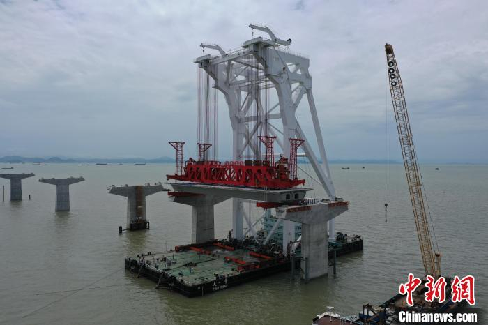 中新网广州6月25日电 (蔡敏婕 岳路建)粤港澳大湾区超级工程深中通道首片混凝土箱梁25日完成架设,标志着项目海域引桥上部结构施工驶入“快车道”。