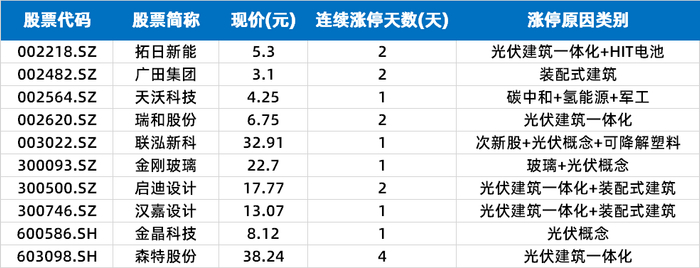昨天掀起涨停潮的BIPV概念今天再度爆发,拓日新能(002218.SZ)、瑞和股份(002620.SZ)、启迪设计(300500.SZ)等2连板。