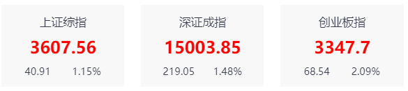 6月25日,沪深两市高开高走,在券商板块爆发的带动下,沪指盘中成功收复3600点整数关口。截至收盘,沪指上涨1.15%,报3607.56点;深成指上涨1.48%,报15003.85点;创业板指上涨2.09%,报3347.70点。