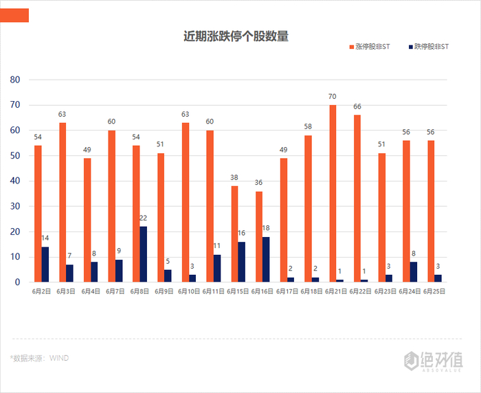 个股涨跌互半,全市场上涨个股2202只,下跌个股1977只;其中,共有涨停个股(非ST)56只,跌停个股(非ST)3只。