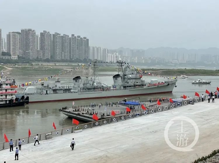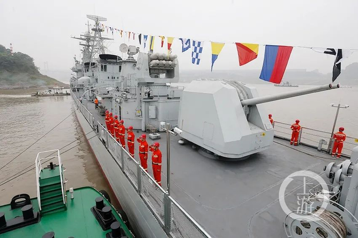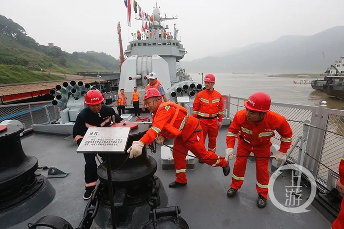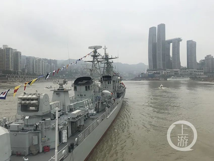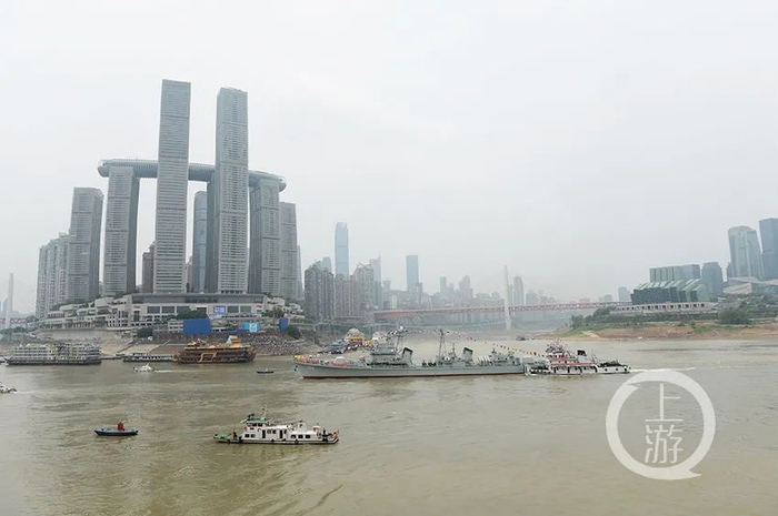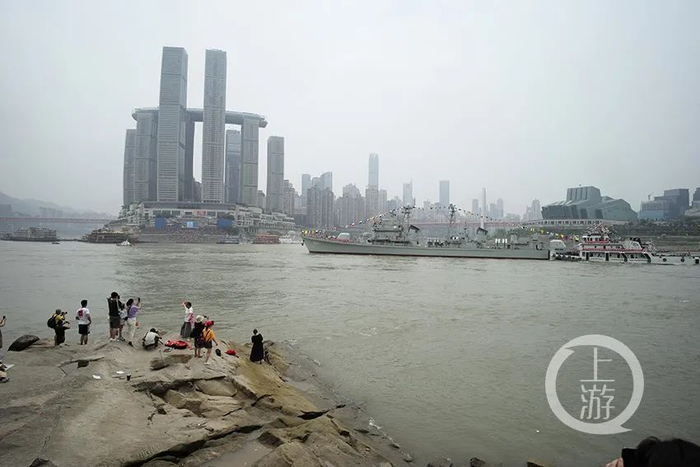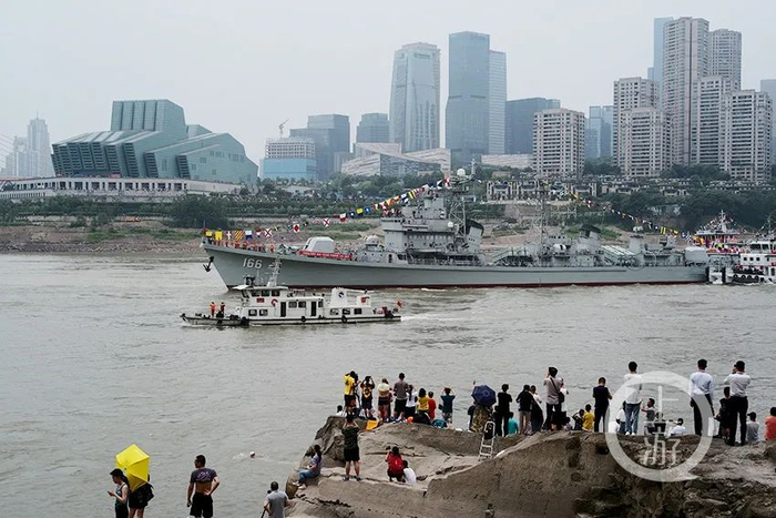 随着166舰溯江而上,经过广阳岛、郭家沱、唐家沱、寸滩港、朝天门、石板坡长江大桥等地标时,沿途均有市民在岸边挥手相迎。