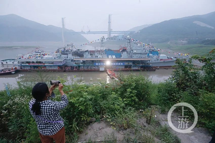 166舰船缓慢驶离明月沱江码头,凭借拖运助力前行,告别停留246天的东港船厂。而长江两岸的市民早已翘首以盼,早早地等在岸边记录和见证166舰的航程。