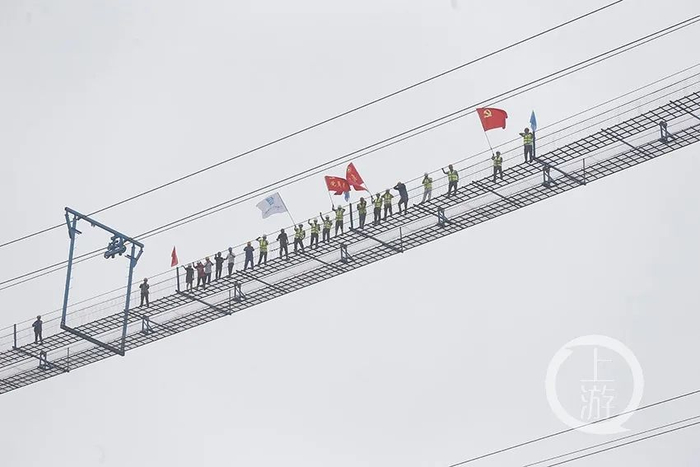 上午十点十分左右,正在郭家沱长江大桥上施工的建筑工人们也举起了红旗、党旗,向166舰致敬。
