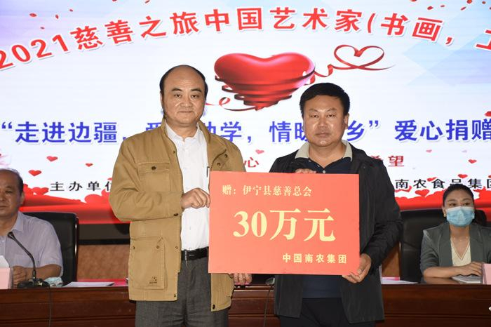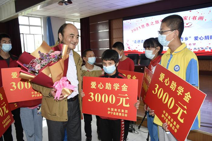 据了解,此次活动由中国民协教育指导委员会策划、倡议,得到了来自南京、河南、甘肃、江苏等地的119名知名书画家、工艺品家的大力支持,艺术家们纷纷拿出优秀精品甚至获奖作品参与慈善活动,通过作品义卖给伊宁县筹集30万元善款,用于资助100名孩子的学习和生活,用实际行动和爱心善举关心边疆的教育事业发展,用爱心温暖孩子们的纯真童心。受捐助学生代表金浩勇表示,此次捐助让他备受感动和鼓励,一定会好好学习,用优异的成绩来回报社会,回报爱心人士的关心关怀,将来把爱心传递下去。