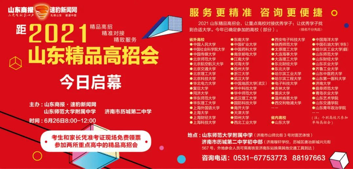 为给考生和家长提供更多便利,今天(6月26日)上午8:00-12:00,2021山东精品高招会在山师附中和历城二中与大家相见。会场分别设置在山师附中艺体馆操场(山师北街3号对面)和位于历城区唐冶新城兴元街567号的历城二中初中部(济南稼轩学校,外地参会人员可乘高铁至济南东站再换乘其他交通工具)。