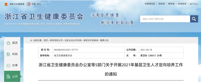 为进一步加强基层卫生人才队伍建设,近日,浙江省卫生健康委员会办公室等五部门印发了《关于开展2021年基层卫生人才定向培养工作的通知》。