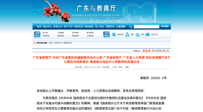 广东省教育厅去年4月22日出台了《广东省教育厅 中共广东省委机构编制委员会办公室 广东省财政厅 广东省人力资源 和社会保障厅关于公费定向培养粤东 粤西粤北地区中小学教师的实施办法》。