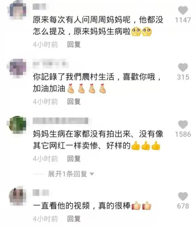 不少网友在了解了周周的经历后对他表示肯定"妈妈生病在家都没有拍出来,没有像其他网红一样卖惨,好样的"、"你记录了我们农村生活,喜欢你,加油加油"、"一直看他的视频,真的很棒"。