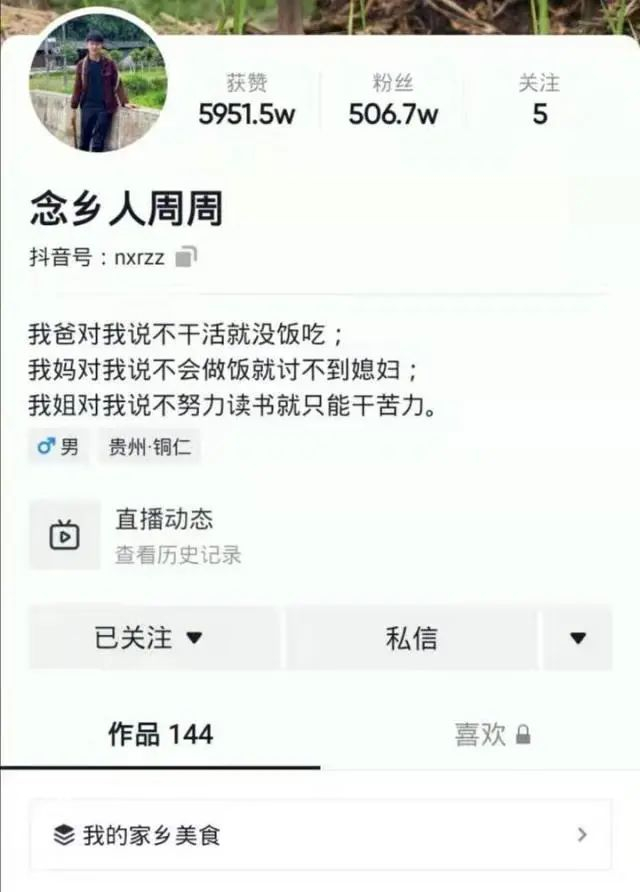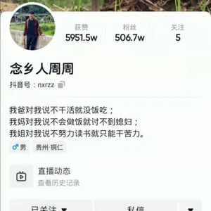 被网友们称为男版李子柒,他就是新晋短视频网红"念乡人周周"。因拍摄贵州农村生活,23 岁的他三年收获 500 万粉丝。他总以乐观的心态面对生活,为了减轻家庭压力,周周拍视频创业挣钱,供姐姐上学和妈妈吃药。
