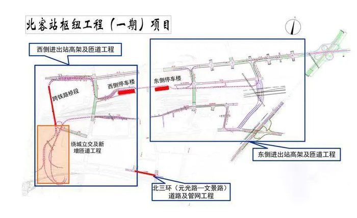 该枢纽工程不仅连通了西安绕城高速和西铜城市快速路,同时还在西安北站的东西两侧均设置了进口和出口,车辆将“东进东出、西进西出”,进出西安北站更加方便快捷。