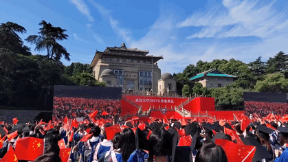 在武汉大学,在毕业典礼上与恩师好友拥抱合影,与万余名毕业生一起在珞珈山等待拨穗;