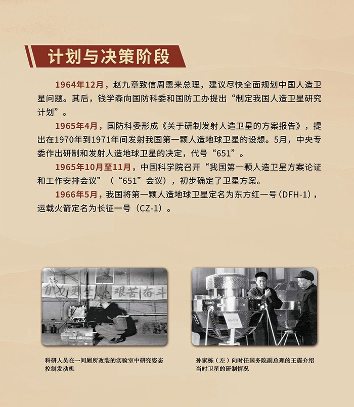 1965年4月,国防科委形成《关于研制发射人造卫星的方案报告》,提出在1970年到1971年间发射我国第一颗人造地球卫星的设想。5月,中央专委作出研制和发射人造地球卫星的决定,代号“651°。
