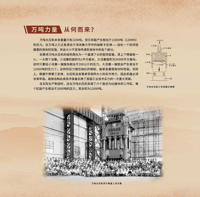 如果将万吨水压机的结构简化为一个盛满了水的密闭容器,其上下两端有一小、一大两个活塞。小活塞的面积为1平方厘米,大活塞面积为34300平方厘米。这时只要给小活塞一端施加相当于350公斤的压力,大活塞一端就会产生相当于12000吨的压力了。这样的压力锻压烧红的钢锭,能够显著提高材料性能。实际上,根据牛顿第三定律,水压机自身需承受相同大小的反作用力,因此机器必须非常牢固。能够自制此类技术装备反映了我国工业技术实力的一次重大突破。