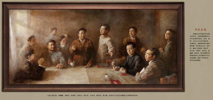 油画由九所李德元所长倡议并命名,五洲传播网络中心作为主要创作单位,陈岱、张恒、王长兴三位艺术家创作,主画陈岱。油画再现原子弹突破时期“学术民主讨论”的历史,描绘了彭桓武、郭永怀、朱光亚、邓稼先、周光召、周毓麟、程开甲、秦元勋等科学家带领科研人员开展学术大讨论的情景,展现了学术民主、科学求实的精神。