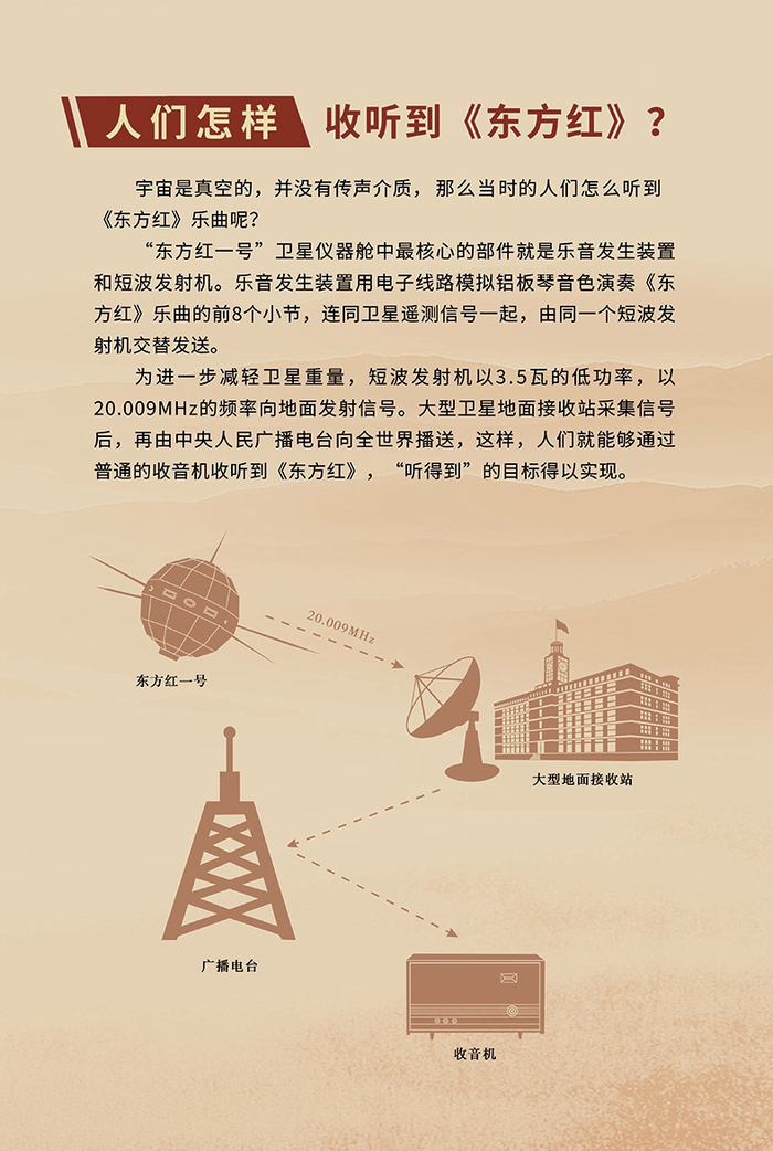 为进一步减轻卫星重量,短波发射机以3.5瓦的低功率,以20.009MHz的频率向地面发射信号。大型卫星地面接收站采集信号后,再由中央人民广播电台向全世界播送,这样,人们就能够通过普通的收音机收听到《东方红》,“听得到”的目标得以实现。