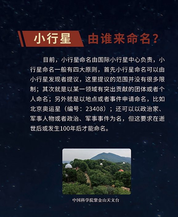 目前,小行星命名由国际小行星中心负责,小行星命名一般有四大原则,首先小行星命名可以由小行星发现者提议,这里提议的范围并没有很多限制;其次就是以某一领域有突出贡献的团体或者个人命名;另外就是以地点或者事件申请命名,比如北京奥运星(编号:23408);还可以以政治家、军事人物或者政治、军事事件为名,但这要求在逝世后或发生100年后才能命名。
