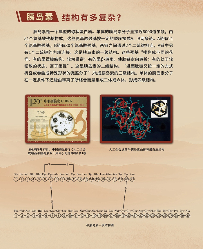 胰岛素是一个典型的球状蛋白质。单体的胰岛素分子量接近6000道尔顿,由51个氨基酸残基构成,这些氨基酸残基按一定的顺序接成A、B两条链。A链有21个氨基酸残基,B链有30个氨基酸残基,两链之间通过2个二硫键相连,A链中另有1个二硫键的内部连接。这是胰岛素的一级结构。这些残基“排列成不同的花样,有的呈螺旋结构,较为紧密;有的呈β-转角,使肽链走向转折;有的处于较松散的状态,富于柔性”。这是胰岛素的二级结构。“进而肽链又按一定的方式折叠或卷曲成特殊形状的完整分子”,构成胰岛素的三级结构。单体的胰岛素分子在一定条件下还能由锌离子所络合而聚集成二体或六体,形成四级结构。