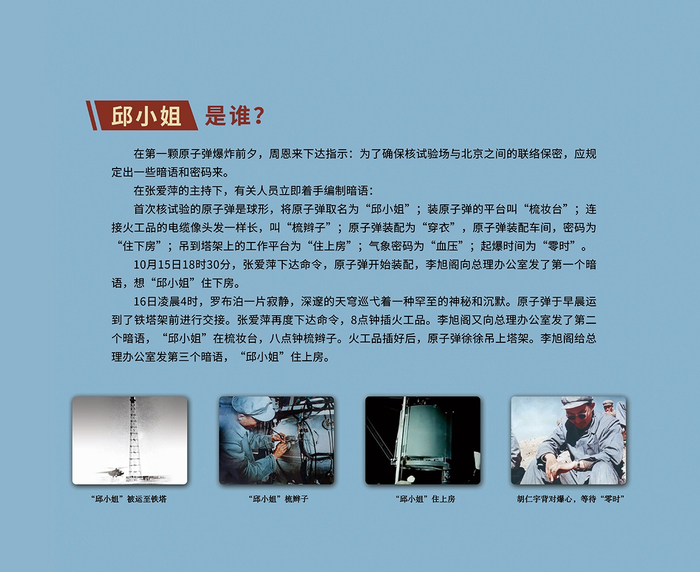 首次核试验的原子弹是球形,将原子弹取名为“邱小姐”;装原子弹的平台叫“梳妆台”;连接火工品的电缆像头发一样长,叫“梳辫子”;原子弹装配为“穿衣”,原子弹装配车间,密码为“住下房”;吊到塔架上的工作平台为“住上房”;气象密码为“血压”;起爆时间为“零时”。