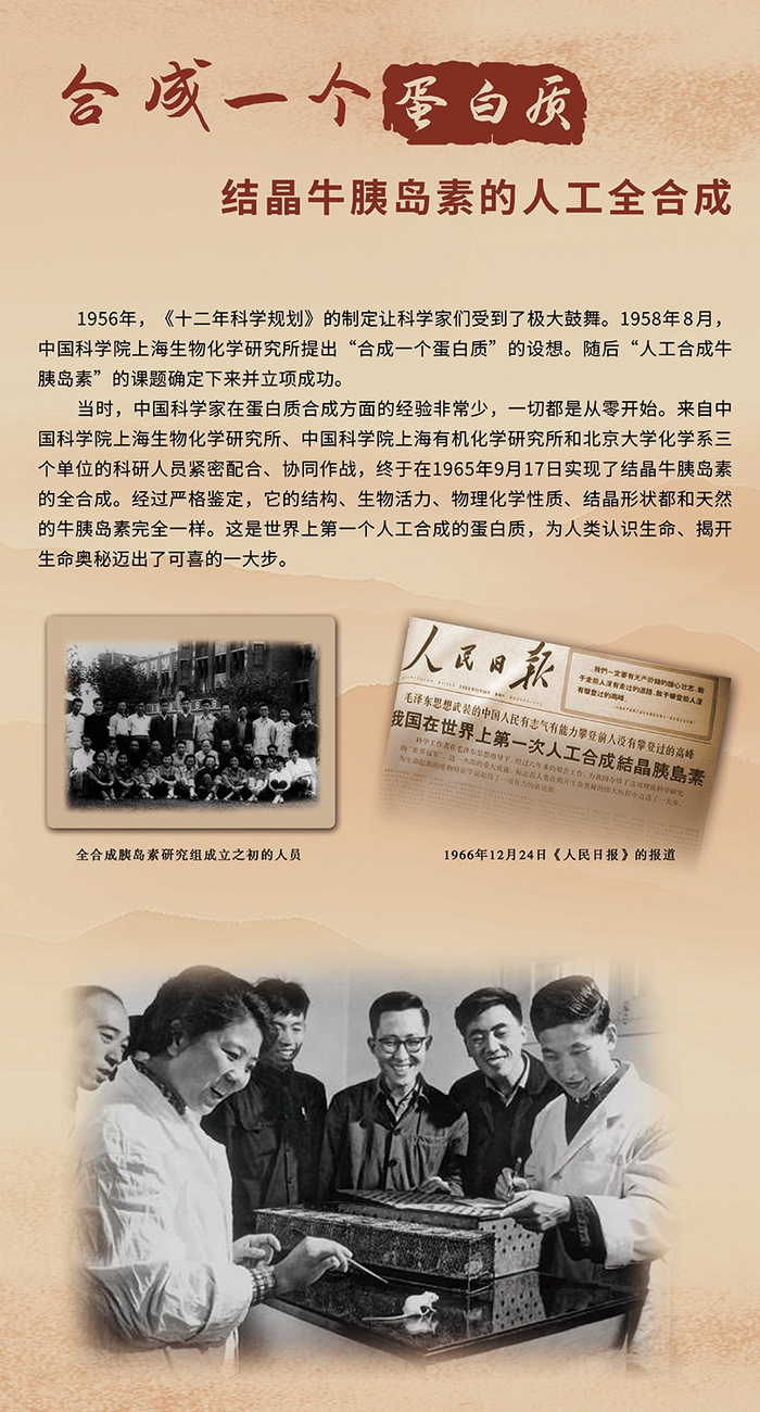 当时,中国科学家在蛋白质合成方面的经验非常少,一切都是从零开始。来自中国科学院上海生物化学研究所、中国科学院上海有机化学研究所和北京大学化学系三个单位的科研人员紧密配合、协同作战,终于在1965年9月17日实现了结晶牛胰岛素的全合成。经过严格鉴定,它的结构、生物活力、物理化学性质、结晶形状都和天然的牛胰岛素完全一样。这是世界上第一个人工合成的蛋白质,为人类认识生命、揭开生命奥秘迈出了可喜的一大步。