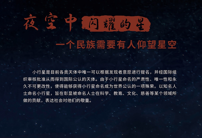 小行星是目前各类天体中唯一可以根据发现者意愿进行提名,并经国际组织审核批准从而得到国际公认的天体。由于小行星命名的严肃性、唯一性和永久不可更改性,使得能够获得小行星命名成为世界公认的一项殊荣。以知名人士命名小行星,旨在彰显被命名人士在科学、教育、文化、慈善等某个领域所做的贡献,表达社会对他们的敬重。