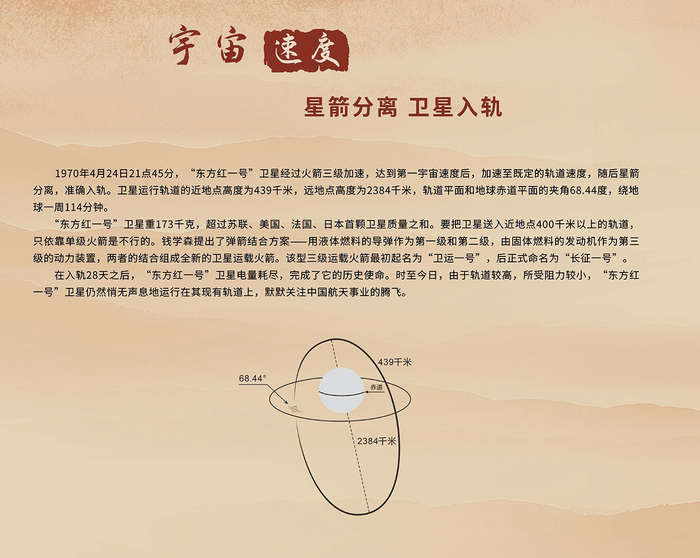 1970年4月24日21点45分,“东方红一号”卫星经过火箭三级加速,达到第一宇宙速度后,加速至既定的轨道速度,随后星箭分离,准确入轨。卫星运行轨道的近地点高度为439千米,远地点高度为2384千米,轨道平面和地球赤道平面的夹角68.44度,绕地球一周114分钟。