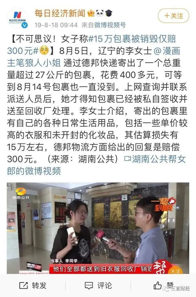 2019年8月,辽宁的李女士称自己通过德邦快递寄出一个重27公斤、总价值15万左右的包裹,被德邦快递工作人员私自签收后,直接送到了旧衣回收站粉碎。按照其说法,这些“总价值15万”的物品最终只能按保价赔付300元。