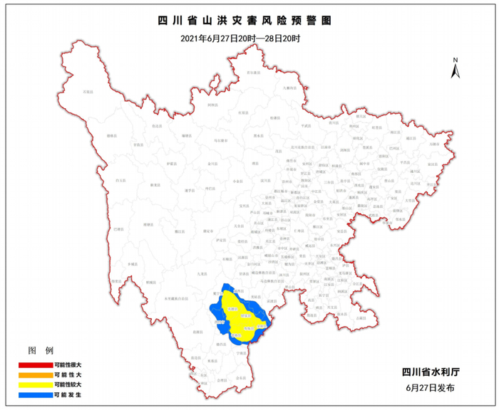 6月27日18时,四川省水利厅发布山洪灾害黄色预警,27日20时至28日20时,冕宁、越西、喜德、昭觉、金阳、布拖、普格等县(市、区)发生山洪灾害可能性较大(黄色);美姑、雷波、西昌等县(市、区)可能发生山洪灾害(蓝色)。这是今年四川发布的首个山洪灾害黄色预警。(四川新闻网)