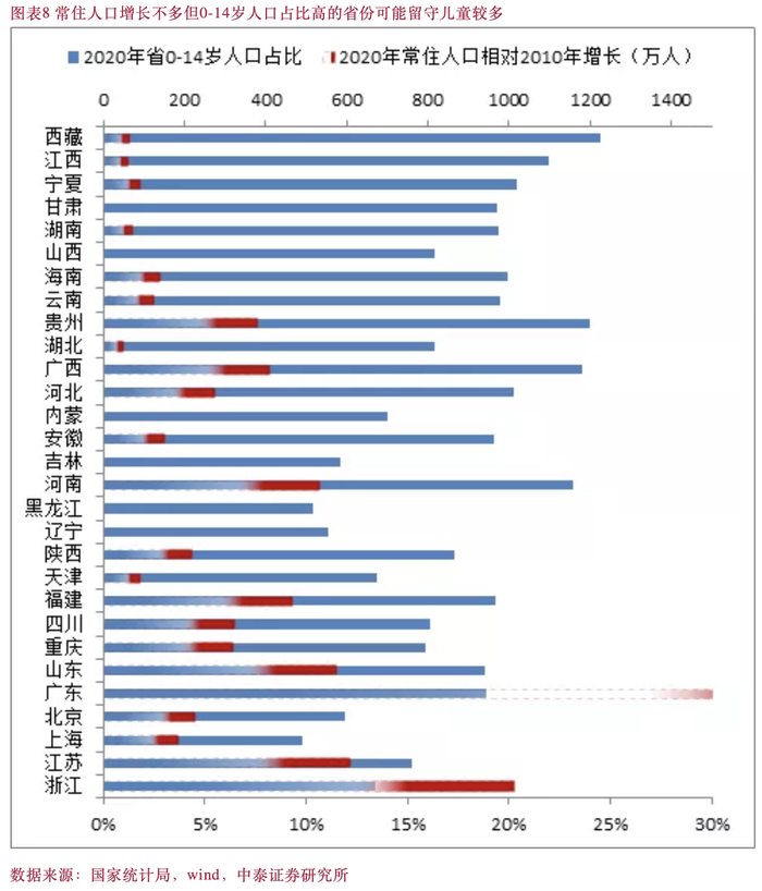 如图表8,西藏、江西、宁夏、甘肃、湖南等省份,一方面0~14岁人口占比较高,说明其过去十来年新出生人口较多;另一方面其过去十年常住人口增长很少,说明劳动年龄人口外流比较多。可以推测这些省份的留守儿童相对较多。事实上,除了浙江、江苏、广东以及北京、上海等直辖市,其余省份可能都存在规模较大的留守儿童。
