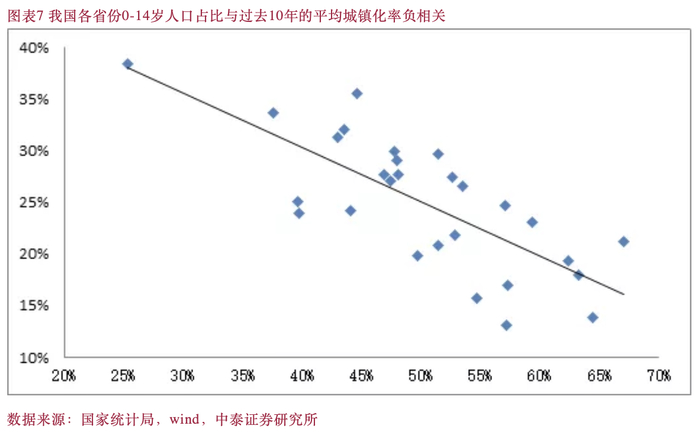 从全球范围来看,城镇化程度高的地区,生育率都相对较低。从国内各省份来看,也明显存在城镇化水平高的省份生育率相对较低的现象。比如用0~14岁人口与15~64岁的比例来代表各省份过去十年的生育率水平,其与各省份过去十年的平均城镇化率呈现明显负相关(见图表7)。可见,即使出台鼓励生育的政策,生育率提升相对明显的也一定是农村和小城镇地区。因此,加强农村和小城镇的教育资源,做好教育公平对提升整体“成才率”非常重要。