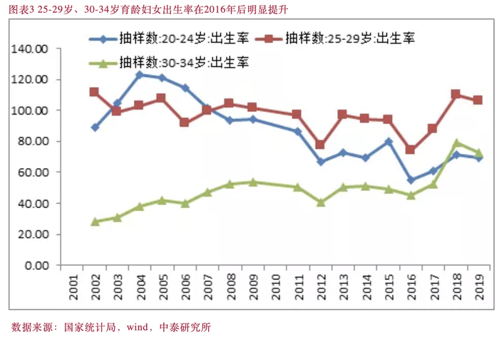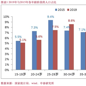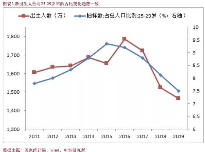 从国家统计局的抽样数据来看,25~29岁与20~24岁的育龄妇女的生育率是最高的,而2019年这两个年龄阶段的人口占比相比2015年下滑3.6个百分点,对应的是这两个阶段的育龄妇女减少约2500万人(14亿人*3.6%*0.5)。从这个角度看,新出生人口从2015年的1655万人下降到2019年的1465万人(下降不到200万人)就显得比较正常了。