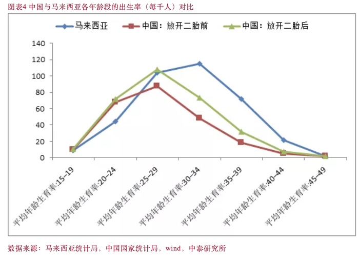 2) 要修正高龄育龄妇女(34~49岁)在过去计划生育政策下的极低生育率,需要找到可供参考和比较的样本。我们找到了城镇化率和人均GDP水平都与我国比较接近且公布了各年龄段妇女生育率的马来西亚作为参考样本。如图表4,在15~29岁的三个年龄段中,中国和马拉西亚的出生率相差不大,后面的年龄段则中国明显偏低。参考马拉西亚各年龄段出生率的分布特征,可以估算假设没有计划生育政策影响下中国34~49岁育龄妇女的出生率,再计算总和生育率。