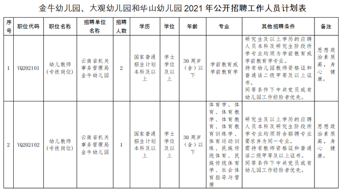 金牛幼儿园、大观幼儿园和华山幼儿园2021年面向社会公开招聘工作人员公告