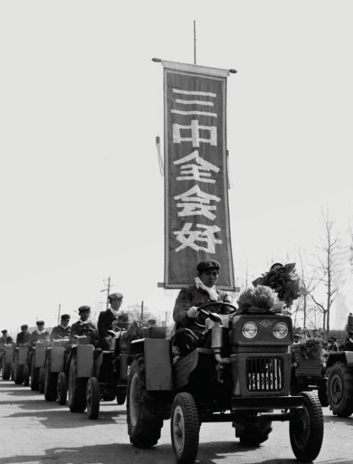 得到实惠的山西农民驾驶着自己的拖拉机,欢呼“三中全会好”。来源:《中国时刻:40年400个难忘的瞬间》,山东画报出版社