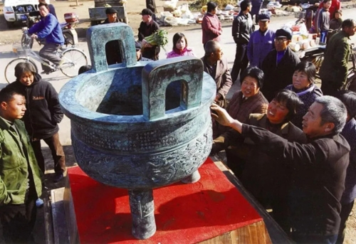 为纪念我国政府取消延续了2600多年农业税,河北灵寿县村民王三妮倾心铸造“告别田赋”青铜鼎。2006年1月28日,王三妮在当地集市上向过往群众介绍铸造青铜鼎的原因、过程和意义。董永博/摄 来源:河北画报