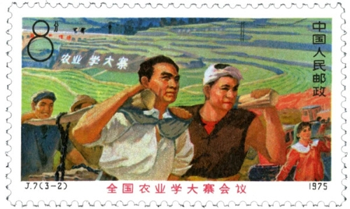 1975年,中国人民邮政发行了全国农业学大寨会议套票,图为其中第二枚“农民搬山造梯田场景”,设计者:李印清。来源:中邮网