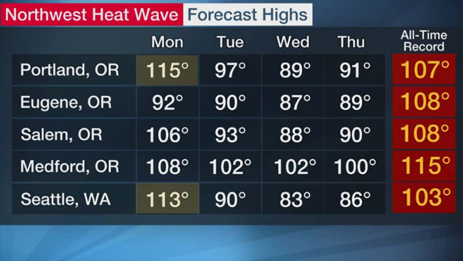 目前,美国西北部和加拿大西南部创纪录的高温仍在持续,甚至当地周一最高气温波特兰会达到115F(约46℃),西雅图113F(约45℃),继续刷新最高气温纪录。