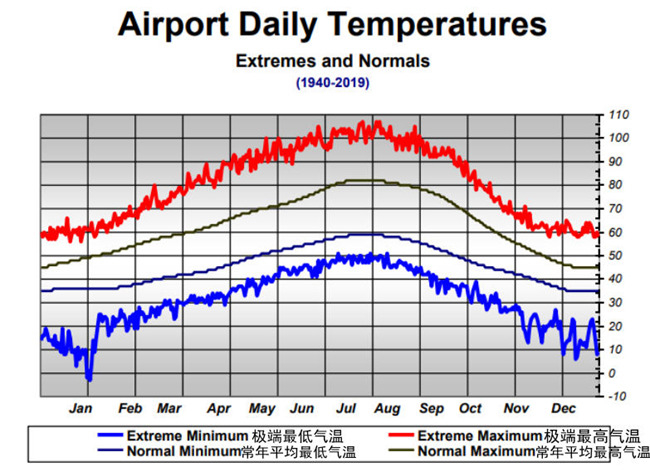 举个例子,下图为波特兰机场1940-2019年气温走势,7月、8月才是气温最高的时段,最热的时段也不过是80F左右(26℃左右),也从未超过110F,而昨天已经达到112F(44℃左右)!