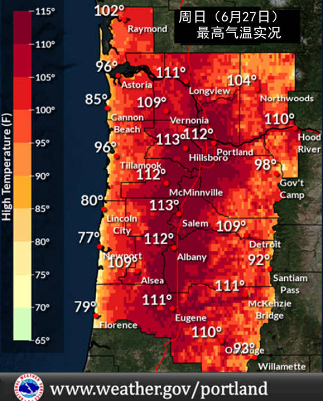 从美国俄勒冈州当地气象部门统计来看,6月26日,特劳特代尔、波特兰、温哥华的最高气温都追平或打破了当地历史最高纪录。