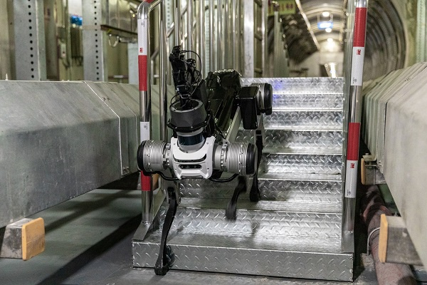 咚——咚——咚——咚,近日,“黑背”一进500千伏虹杨电缆隧道,就迈开四脚向隧道纵深走去,有时抬头挺胸大步流星,有时不紧不慢,东瞧瞧西望望,有时伸长脖子,驻足凝视……“当前位置 500千伏虹杨隧道4号至5号竖井区间,智能巡检四足机器人姿态稳定,电量充足,机械臂及搭载设备等情况正常,速度0.2米/秒,已升起机械臂,并切换至接头区域巡视模式……”令后台电力作业人员更为放心的是,“黑背”遇到防火门槛,就轻松“跨栏”,走到台阶前,能拾级而上。
