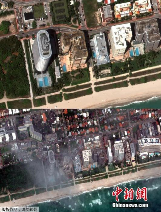 当地时间6月24日凌晨,美国佛罗里达州迈阿密-戴德县一座高层公寓突然发生局部坍塌。图为高楼坍塌前后卫星对比图,上图为2021年3月11日迈阿密-戴德县高层公寓的卫星图片,下图为2021年6月25日迈阿密-戴德县高层公寓倒塌后的卫星图片。