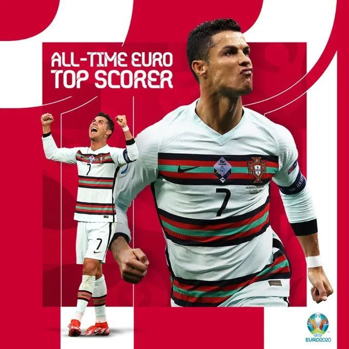 在过去4场比赛中,C罗打入5球。他的欧洲杯总进球数达到14粒,远远超出了排在历史第2位的普拉蒂尼。本届欧洲杯,C罗不但成为赛事历史最佳射手,他还追平了由伊朗球星阿里-代伊所保持的国家队进球世界纪录(109)。